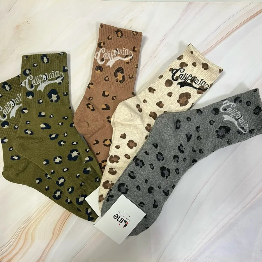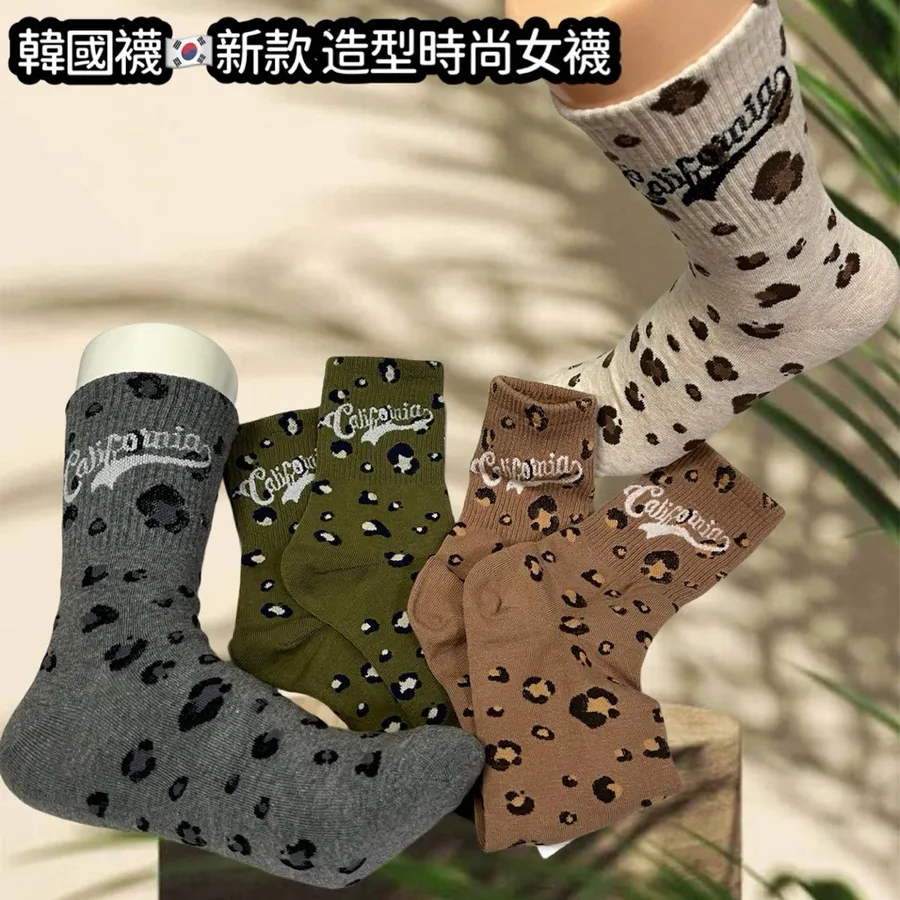 韓國製 草寫配豹紋 滿版豹紋 中筒襪女襪 #23-25cm