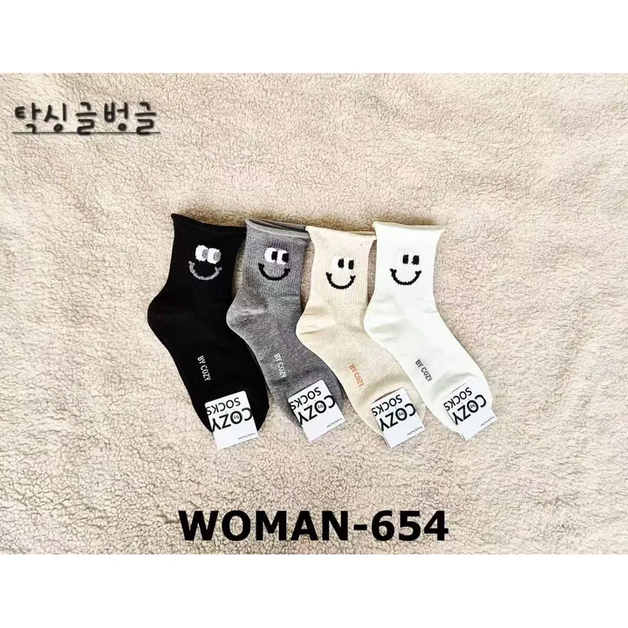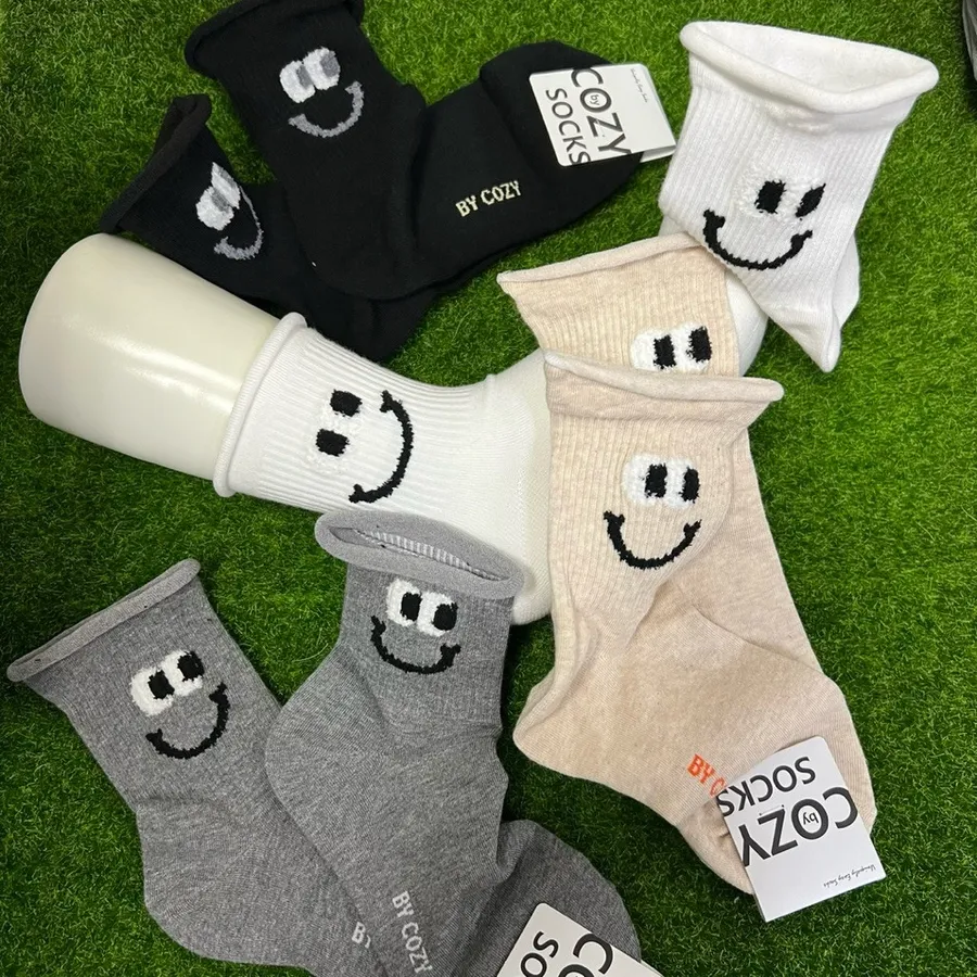 韓國製 東大門植絨素色 眼睛笑臉卷邊中筒襪 #22-26cm