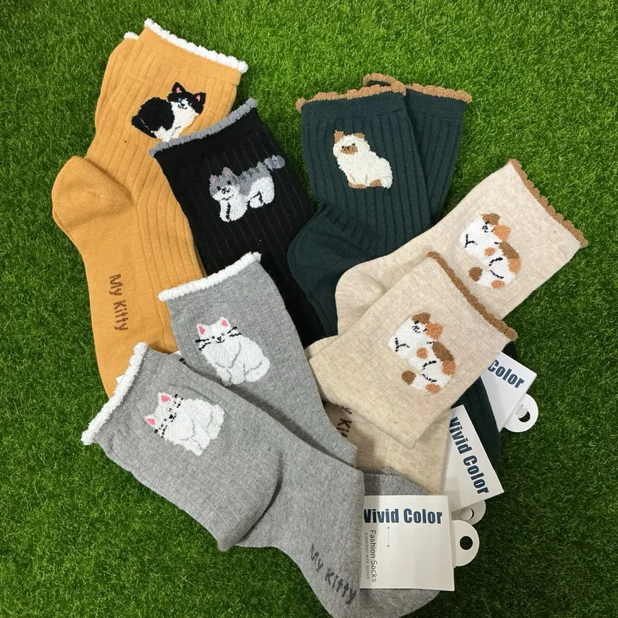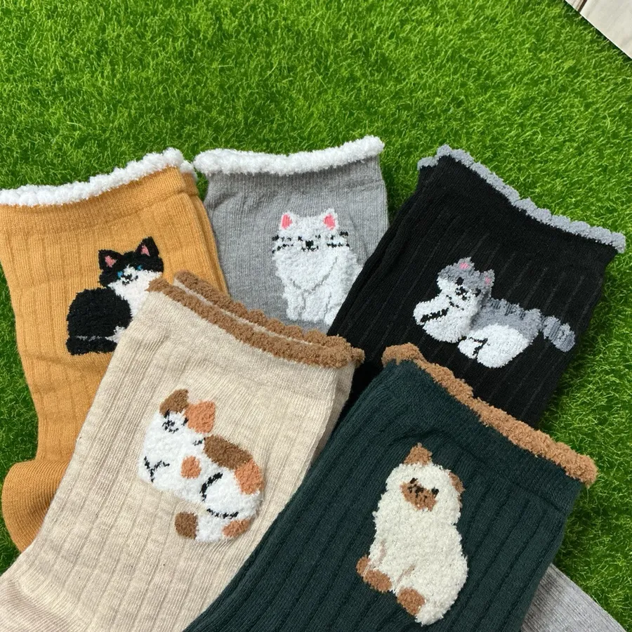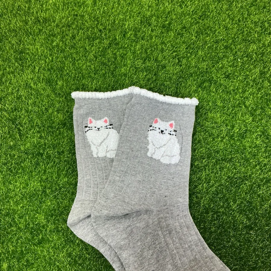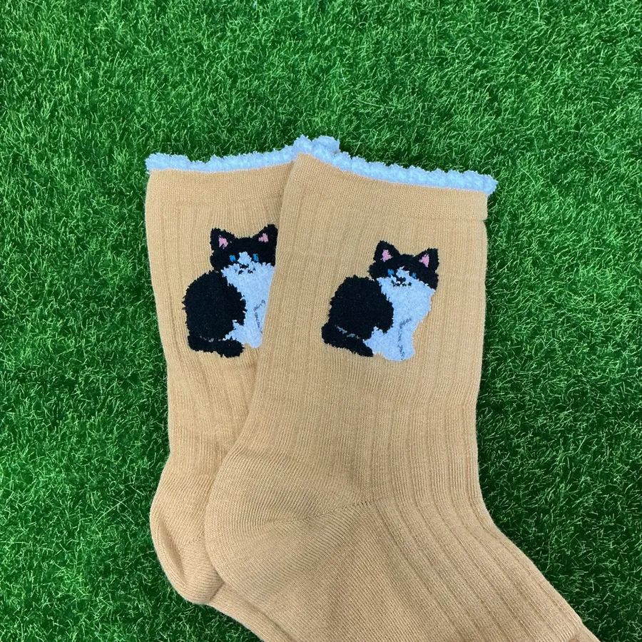 韓國製 貓咪毛毛滾邊中筒襪 #22-24cm