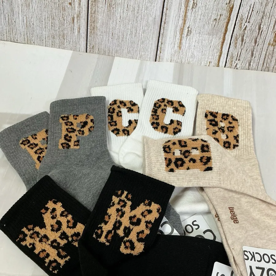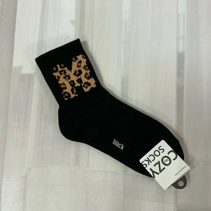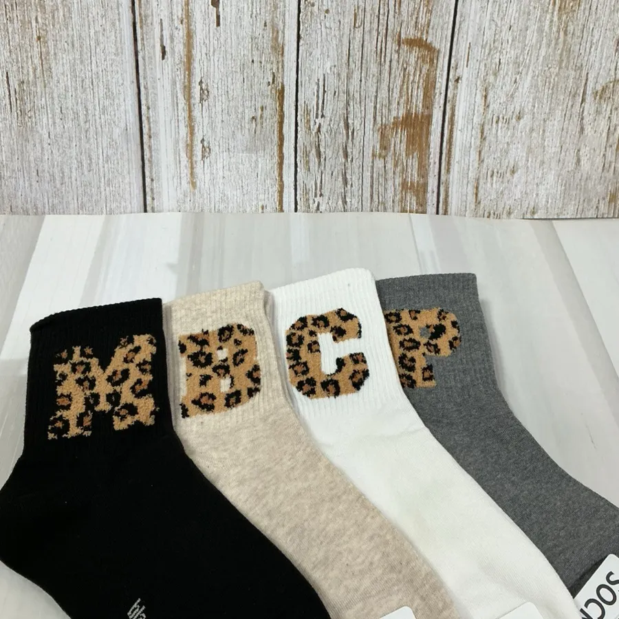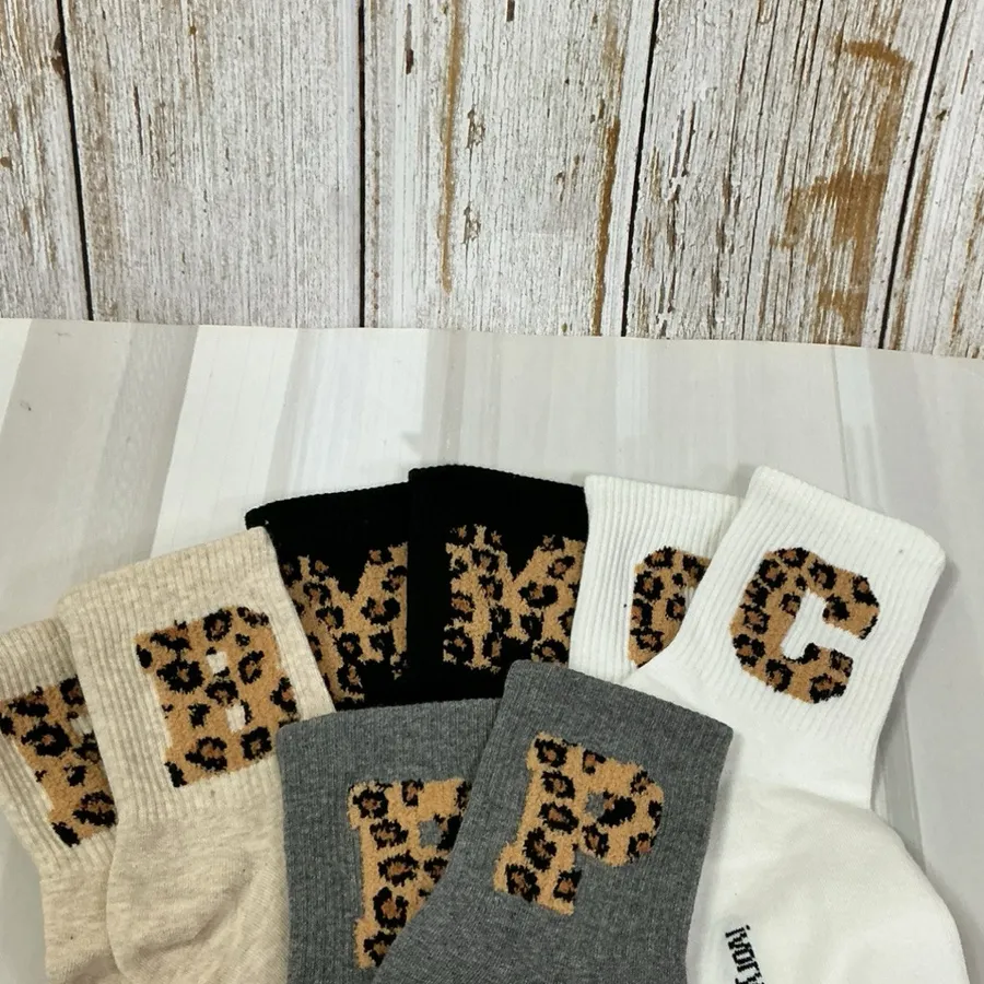 韓國製 豹紋絨毛字母 女短襪 #22-26cm