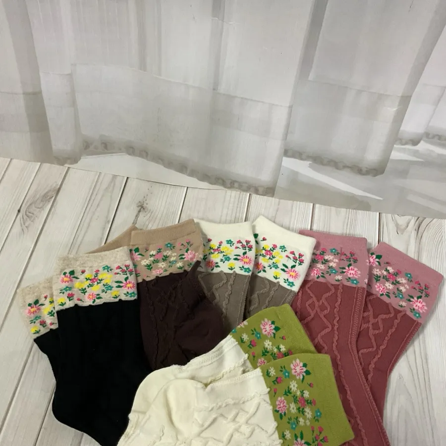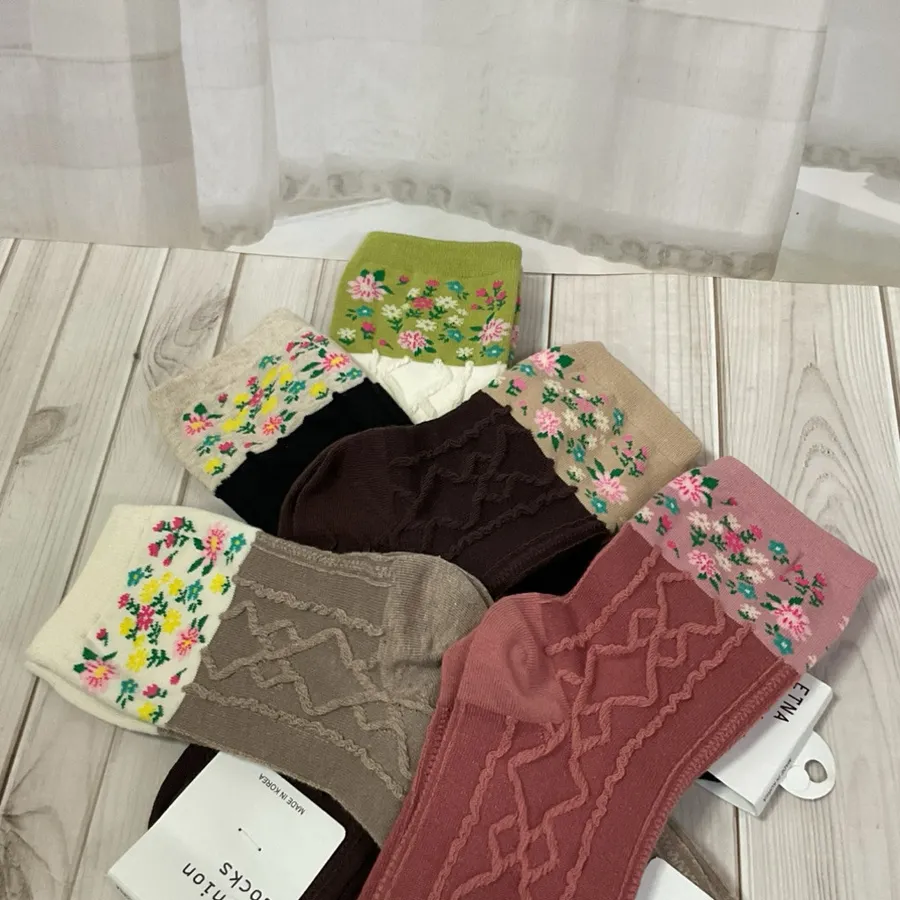 韓國製 花花線條壓紋中筒棉襪 #23-25cm #小碎花